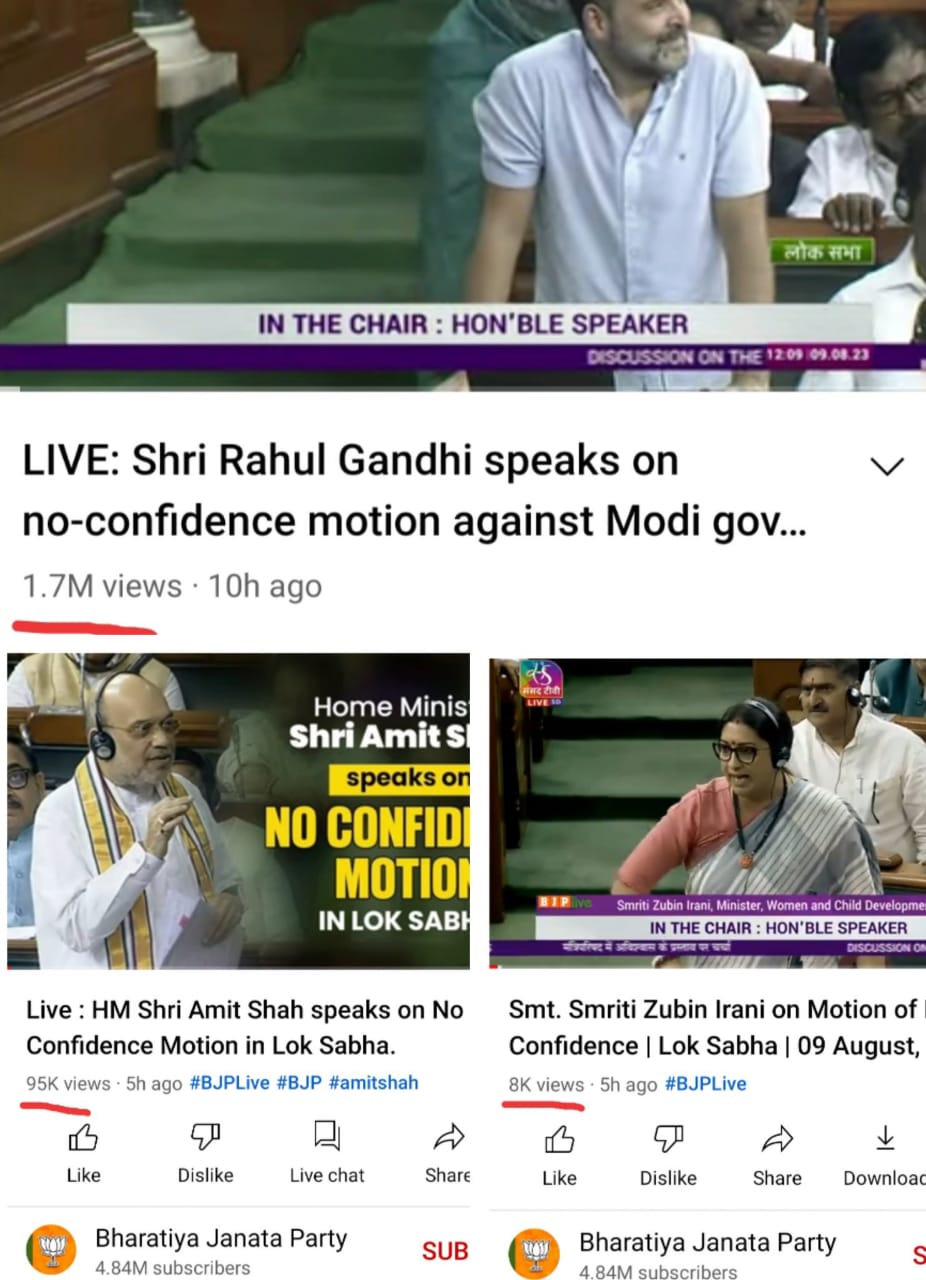 राहुल गांधी के भाषण पर व्यूज़ – 17 लाख. अमित शाह के भाषण पर व्यूज़ – 95 हजार.स्मृति ईरानी के भाषण पर व्यूज़ – 8 हजार…….