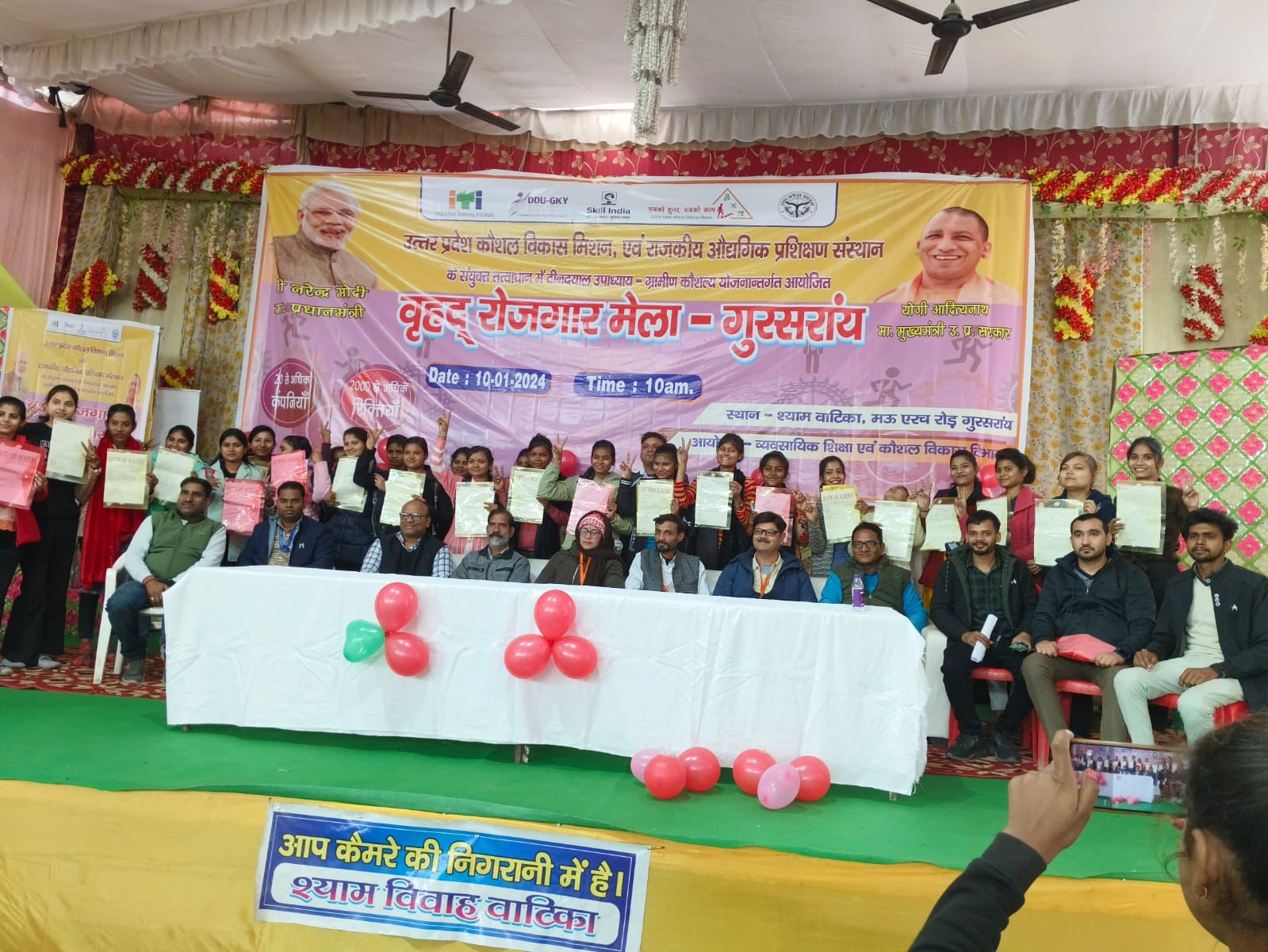 जनपद झांसी ब्लाक गुरसराय में उत्तर प्रदेश कौशल विकास मिशन राजकीय औद्योगिक प्रशिक्षण संस्थान एवं सेवायोजन कार्यालय द्वारा संयुक्त रूप से भारत सरकार की महत्वाकांक्षी योजना दीनदयाल उपाध्याय ग्रामीण कौशल योजना के अंतर्गत आज दिनांक 10जनवरी 2024 को श्याम वाटिका मऊ एरच रोड गुरसराय में रोजगार मेला का शुभारंभ मुख्य अतिथि श्री जयपाल सिंह चौहान अध्यक्ष नगर पालिका गुरसराय हुआ विशिष्ट अतिथि श्री प्रसिद्ध नारायण यादव जी श्री अवधेश सिंह श्री राम अध्यक्ष जी द्वारा मेले में उपस्थित युवाओं को संबोधित किया गया और सरकार द्वारा संचालित उत्तर प्रदेश कौशल विकास मिशन के अंतर्गत योजनाओं के विषय में बताया गया जिला समन्वय उत्तर प्रदेश कौशल विकास मिशन द्वारा युवाओं को प्रोत्साहित करते हुए कहा कि सरकार की योजनाओं का लाभ लेते हुए रोजगार स्थापित करें इस रोजगार मेले में उत्तर प्रदेश कौशल विकास मिशन दीनदयाल उपाध्याय ग्रामीण कौशल योजना आईटीआई एवं डिप्लोमा होल्डर के साथ 462 अभ्यर्थियों द्वारा पंजीकरण कराया गया जिसके सापेक्ष 147 को विभिन्न अधिष्ठानों सॉफ्टवेयर एकेडमी, पुखराज हेल्थ केयर ,प्रथम एजुकेशन , आईसेक्ट, एल आई सी, एडुवेंटेज आदि द्वारा चयनित किया गया माननीय अध्यक्ष महोदय व सभी विशिष्ट अतिथियों एवं जिला समन्वयक श्री राजकुमार उत्तर प्रदेश कौशल विकास मिशन द्वारा चयनित अभ्यर्थियों को नियुक्ति पत्र वितरित किए गए । जिला समन्वयक द्वारा सभी अतिथियों और चयनित अभ्यर्थियों का आभार व्यक्त किया गया । जिला कौशल प्रबंधक श्री आदर्श श्रीवास्तव ने मेले में आए अभ्यर्थियों को उत्तर प्रदेश कौशल विकास मिशन योजना के बारे में जानकारी दी जिला कौशल प्रबंधक श्री नीरज कुमार यादव द्वारा अभ्यर्थियों के उज्जवल भविष्य की कामना करते हुए प्रतिभागियों को संबोधित किया अंत में कार्यक्रम समापन पर जिला कौशल प्रबंधक कीर्ति लता गौर ने सभी के सहयोग से मेले के सफल आयोजन पर धन्यवाद दिया मेले में राकेश चतुर्वेदी, माधुवेंद्र , पुष्पेंद्र, रोहित , जय सिंह सुरेन्द्र, सूर्यकांत, एवम पुरुषोत्तम भैया आदि रोजगार मेले में उपस्थित हुए।