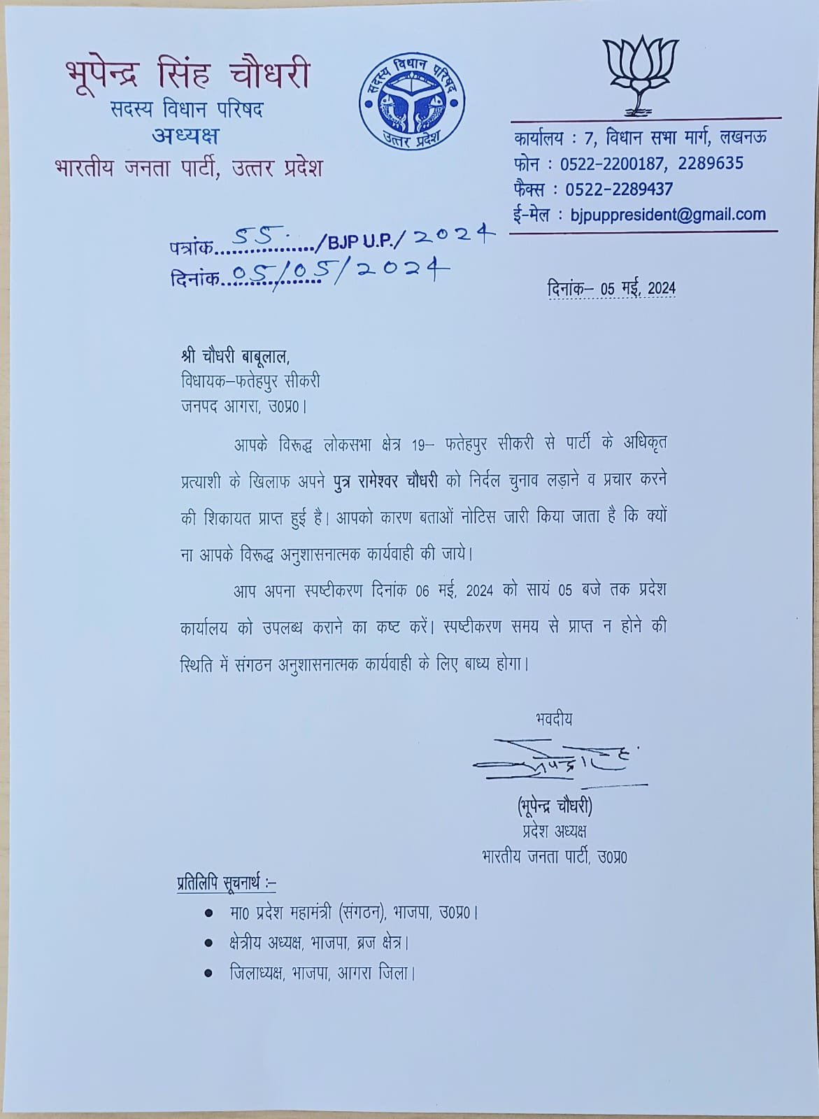 भाजपा प्रदेश अध्यक्ष भूपेंद्र चौधरी ने कारण बताओ नोटिस जारी