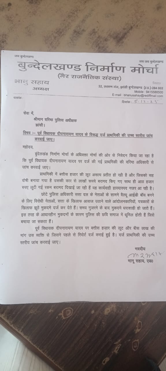 झांसी: पूर्व विधायक दीपनारायण यादव के विरूद्ध दर्ज प्राथमिकी की उच्च स्तरीय जांच करवाई जाए