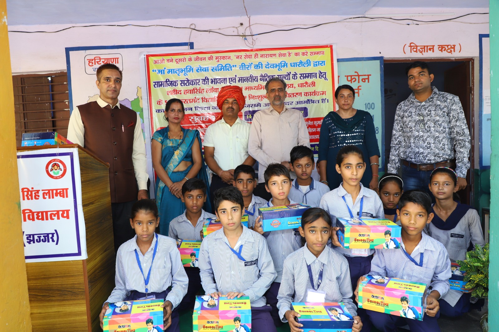 झज्जर : जिला मुख्यालय के अंतिम छोर पर बसे वीरों की देवभूमि कहे जाने वाले गांव धारौली की सामाजिक संस्था मां-मातृभूमि सेवा समिति द्वारा लोकाः समस्ताः सुखिनोभवंतु अर्थात सभी लोग का भला हो, सामाजिक सरोकार की भावना और मानवीय नैतिक मूल्यों को ध्यान में रखते हुए शहीद हवा सिंह लांबा राजकीय माध्यमिक विद्यालय, धारौली में विद्यालय के 54 जरूरतमंद विद्यार्थियों को निःशुल्क एक्शन कंपनी के स्कूल टाइम्स ब्रांड के 20,385 रुपये में खरीदे गए 54 जोड़ी जूते वितरित किये। निशुल्क जूते पाकर छात्र-छात्रायें बेहद खुश और उत्साहित नजर आये।