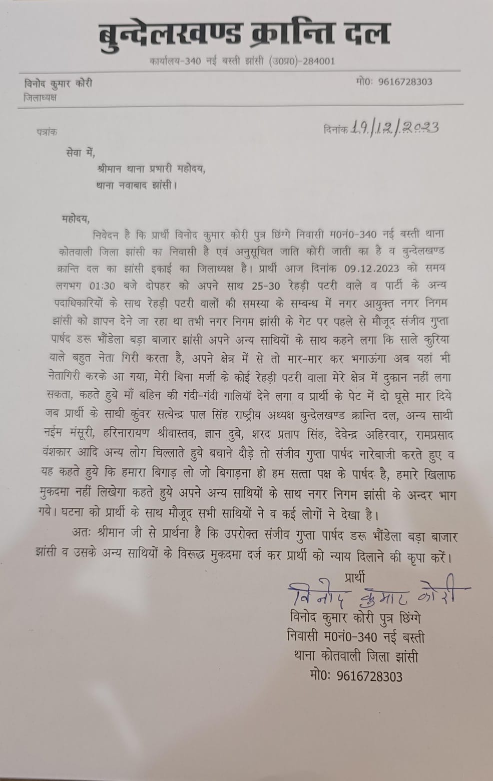आरोप है कि जान से मारने की धमकी दी, अपमानित किया , मारपीट कर दी, ऐलान किया की पटरी दुकानदारों को दुकान नहीं लगाने देंगें। जिलाध्यक्ष विनोद वर्मा ने थाना नवाबाद में प्रार्थना पत्र देकर कार्यवाही की मांग की है।