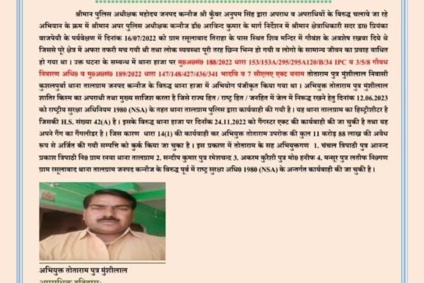 कन्नौज: साम्प्रदायिक दंगे के मुख्य आरोपी तोताराम पर लगी रासुका
