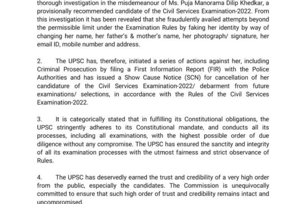 *UPSC ने IAS पूजा खेड़कर के खिलाफ FIR दर्ज कराने के आदेश दिए हैं।* IAS पूजा खेड़कर के फर्जीवाड़े का बड़ा खुलासा जांच में हुआ है। पूजा ने सभी अटेम्प्ट खत्म होने के बाद भी परीक्षा में शामिल होने के लिए अपने नाम में तब्दीली की, मां और पिता के नाम में भी बदलाव किया।…