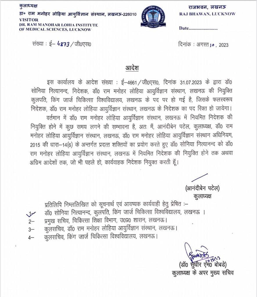 KGMU प्रमुख सोनिया नित्यानंद को लखनऊ के राम मनोहर लोहिया संस्थान का अतिरिक्त प्रभार